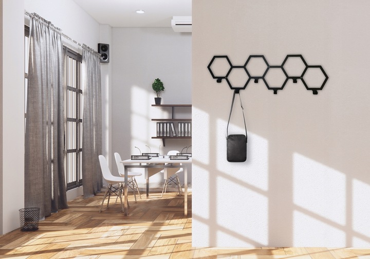 Czarny Wieszak na Ubrania Ścienny Heksagon 6 Haków to wyjątkowy element wyposażenia, który nie tylko dodaje elegancji, ale także praktyczności do każdego wnętrza. Zainspirowany motywem połączonych sześciokątów, ten duży wieszak ścienny jest idealny do użytku zarówno w domu, jak i w przestrzeniach komercyjnych.